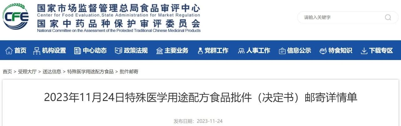 11月24日,總局審評中心發(fā)布特殊醫(yī)學用途配方食品批件郵寄詳情單,涉及冬澤特醫(yī)4款產(chǎn)品,詳情如下: