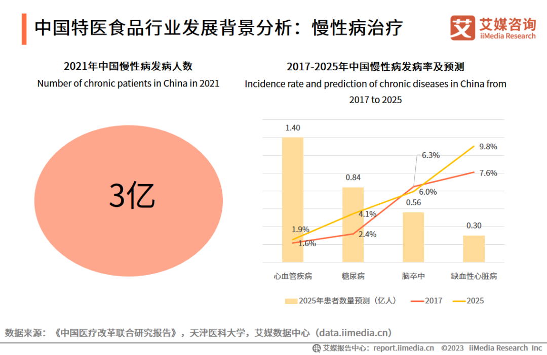 隨著人口老齡化、城鎮(zhèn)化、工業(yè)化進(jìn)程加快和行為危險(xiǎn)因素流行對慢性病發(fā)病的影響,中國慢性病患者基數(shù)不斷擴(kuò)大。數(shù)據(jù)顯示,2021年中國有3億慢性病患者,癌癥、糖尿病和心臟病等慢性病成為主要的健康威脅。特醫(yī)食品作為慢性病患者的主要臨床營養(yǎng)支持產(chǎn)品,將更加受到重視。