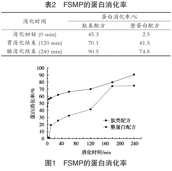 首次嘗試采用INFOGEST的體外消化模型, 模擬人體胃腸消化環(huán)境, 對(duì)選擇水解乳清蛋白作為蛋白來(lái)源 的特殊醫(yī)學(xué)用途全營(yíng)養(yǎng)配方食品 (以下稱(chēng)為: 肽類(lèi)配方) 和市售的蛋白來(lái)源為整蛋白 (濃縮乳清蛋白+酪蛋白) 的同 類(lèi)特殊醫(yī)學(xué)用途全營(yíng)養(yǎng)配方食品 (以下稱(chēng)為: 整蛋白配方) 作對(duì)比, 分析蛋白消化的差異。兩款產(chǎn)品在消化初始 (0 min)、胃消化結(jié)束 (120 min)、腸消化結(jié)束 (240 min) 時(shí)的蛋白消化率結(jié)果分別為: 肽類(lèi)配方45.3%, 70.1%和90.5%; 整 蛋白配方2.5%, 41.5%和74.8%。結(jié)果表明: 肽類(lèi)配方的消化率明顯高于整蛋白配方, INFOGEST體外模擬方法可靠, 接近人體消化的實(shí)際情況, 適用于FSMP產(chǎn)品的篩選和評(píng)價(jià)。